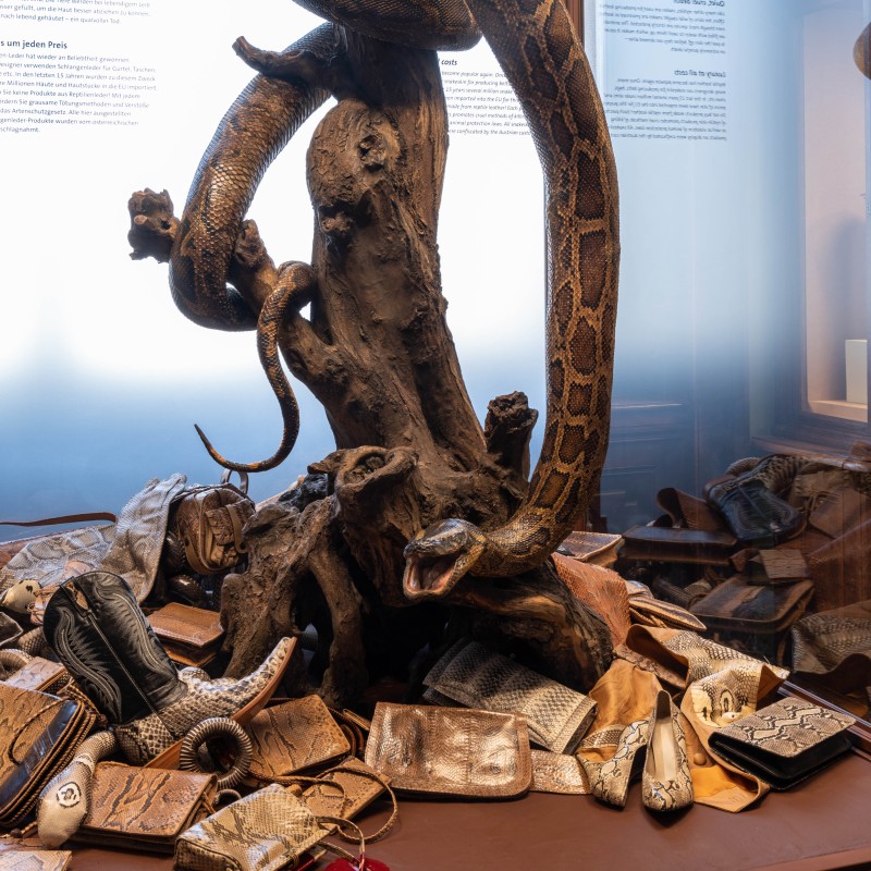 Vitrine im ersten Stock des NHM Wien behandelt die dringliche Thematik des Artenschutzes mit Fokus auf Reptilien. Schlangen