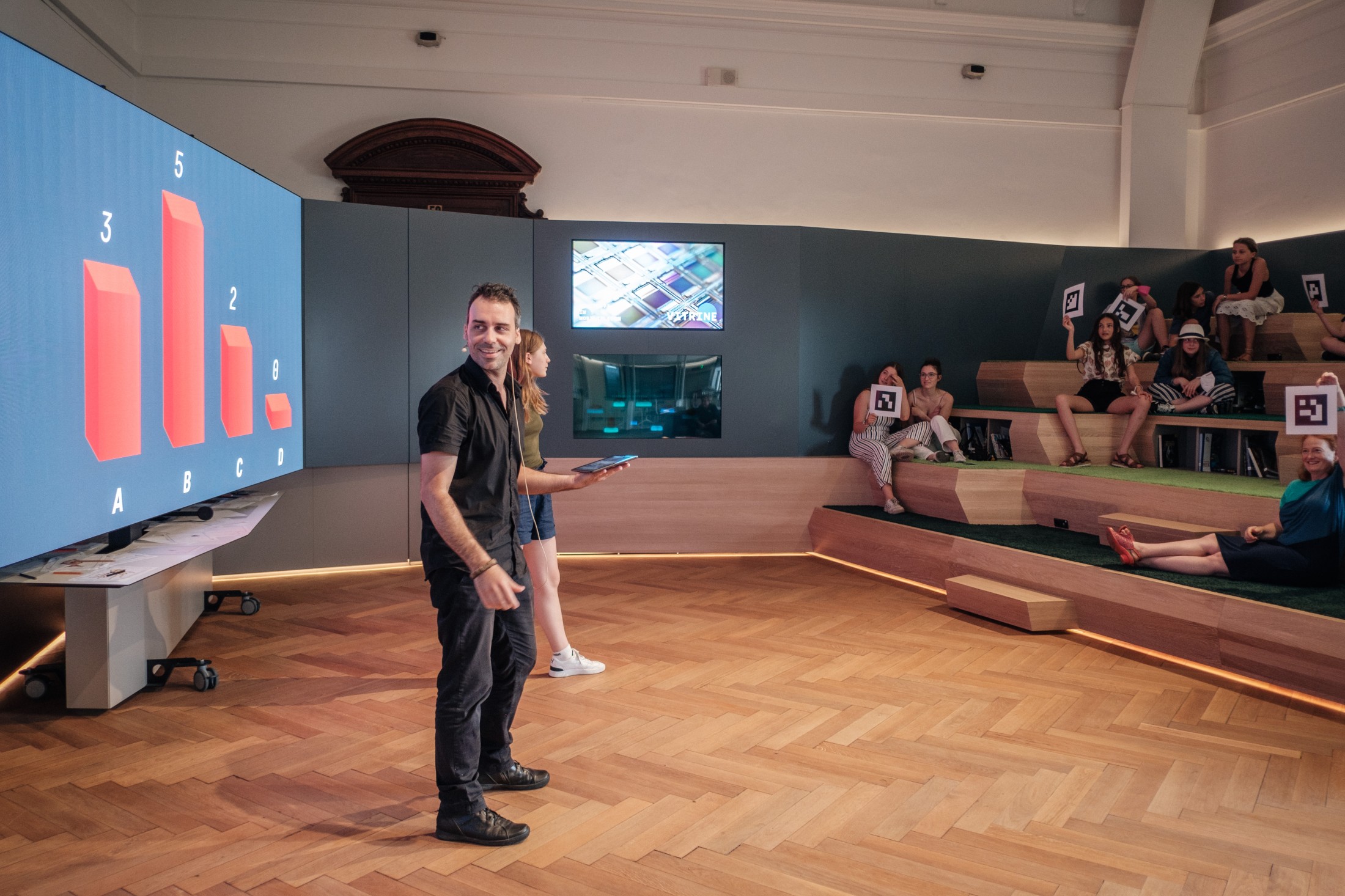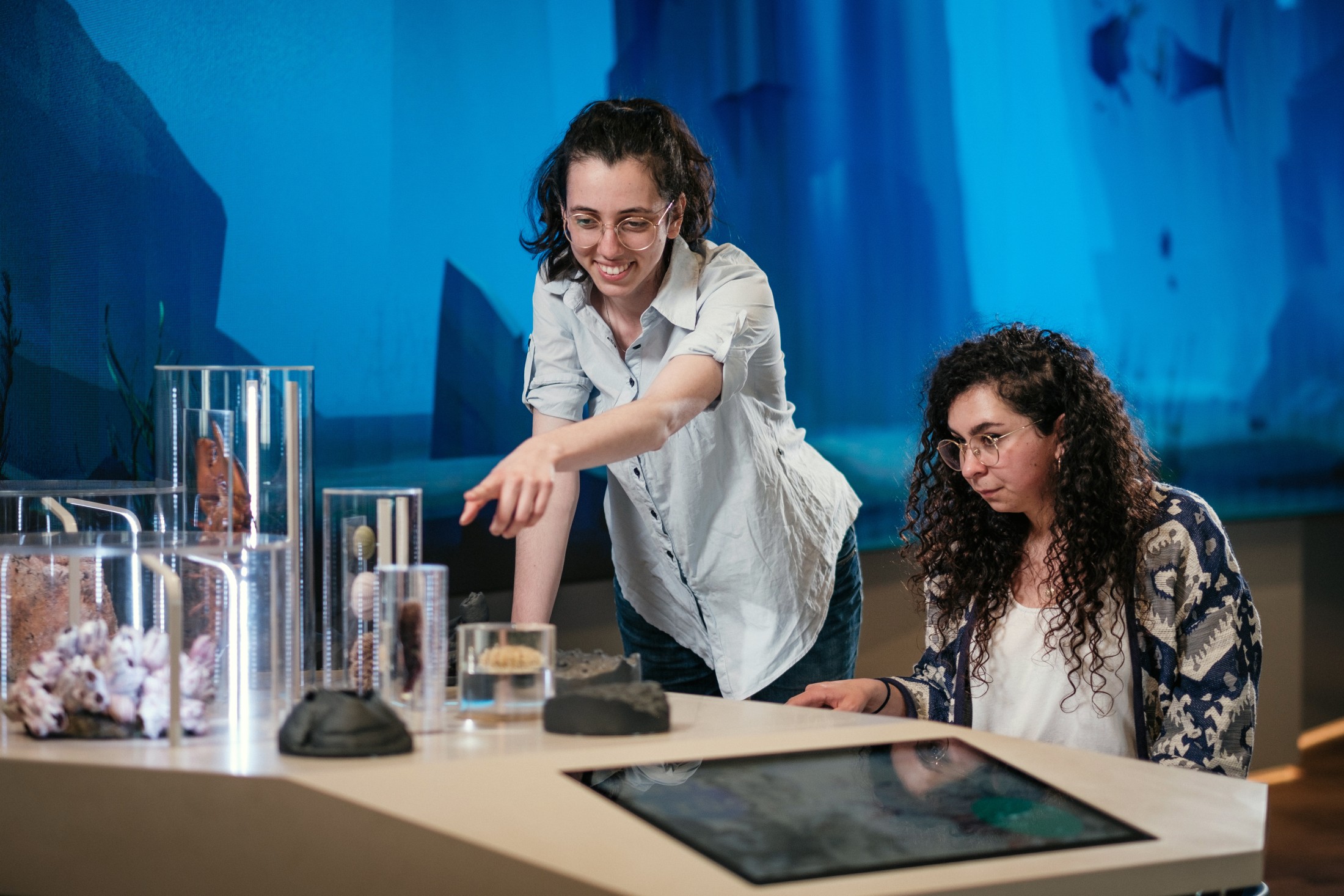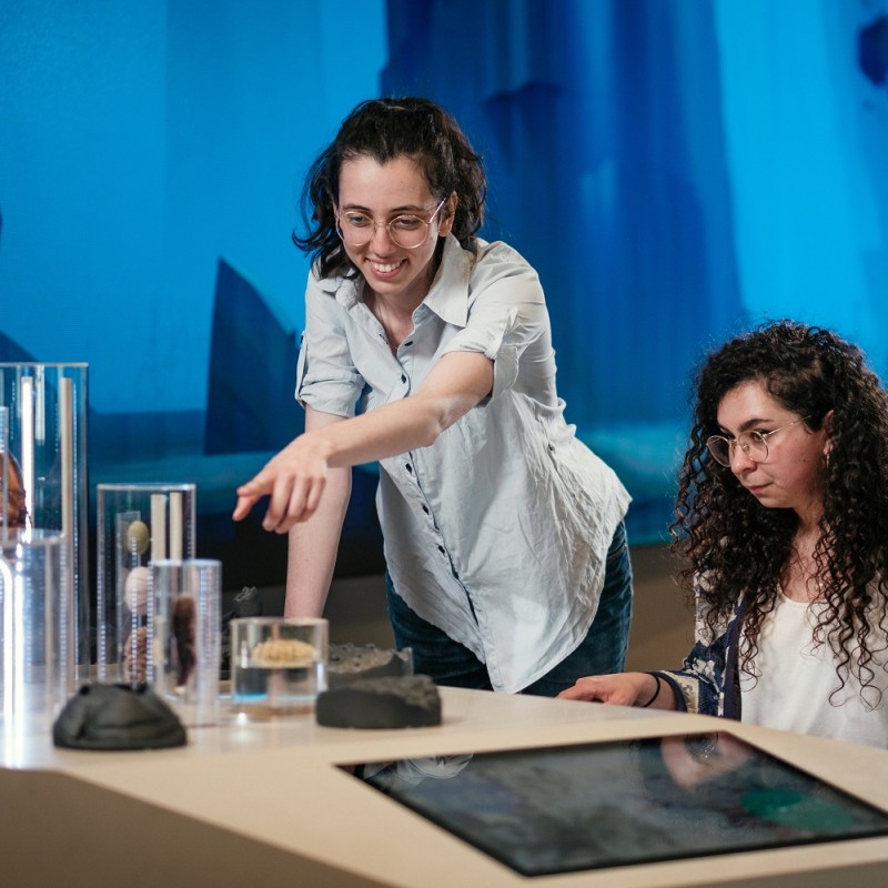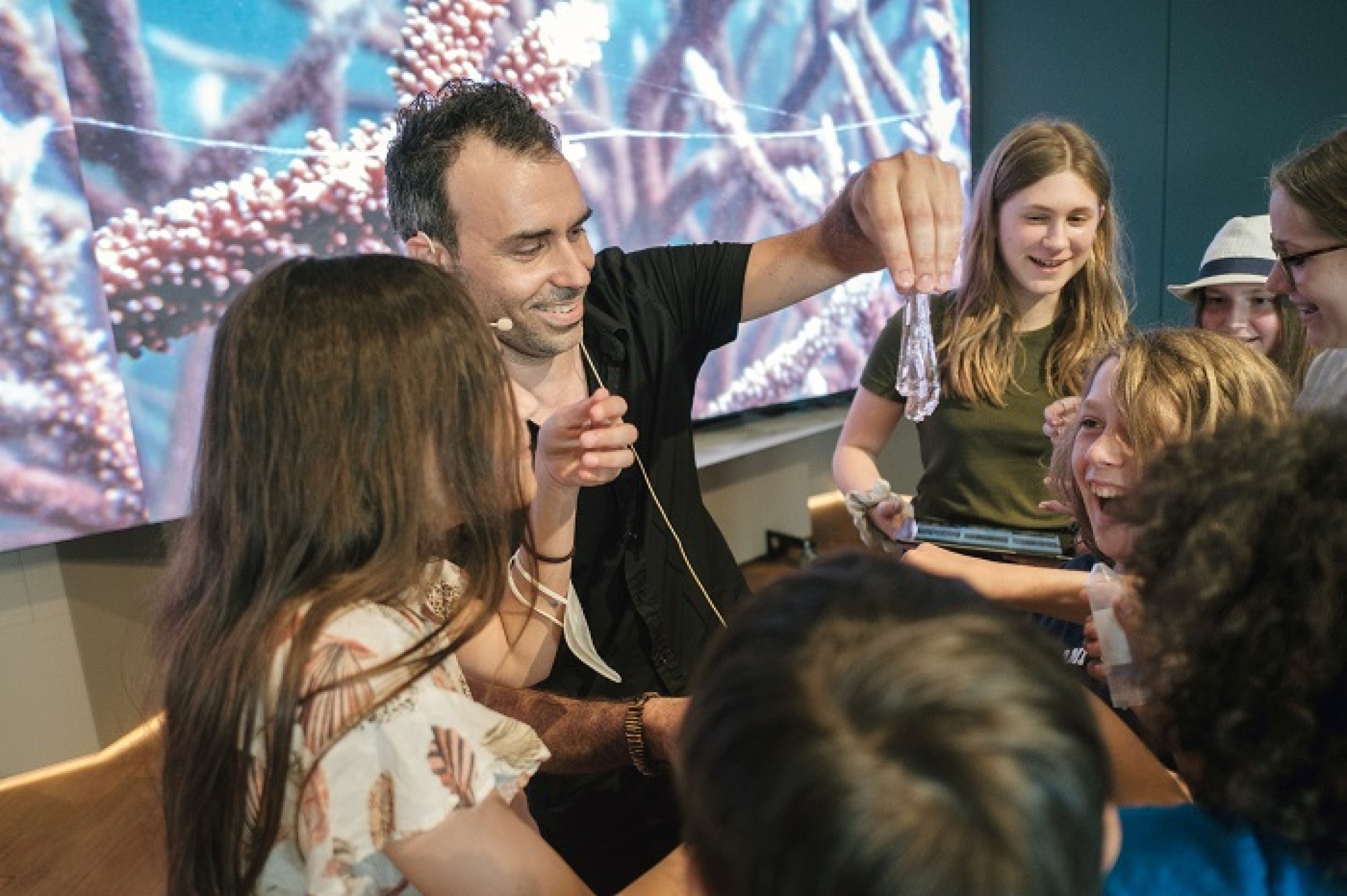 Vermittler*innen des NHM Wien geben eine Vorführung der neuen Showformate auf Deck 50 – Dinoshow, Science Quiz und Mikrotheater.