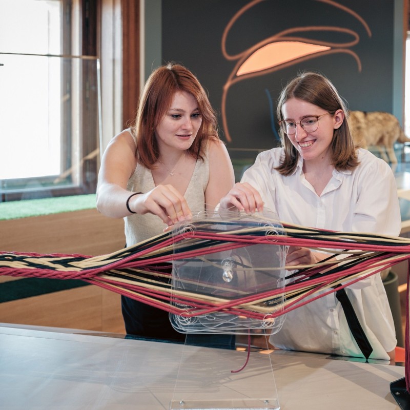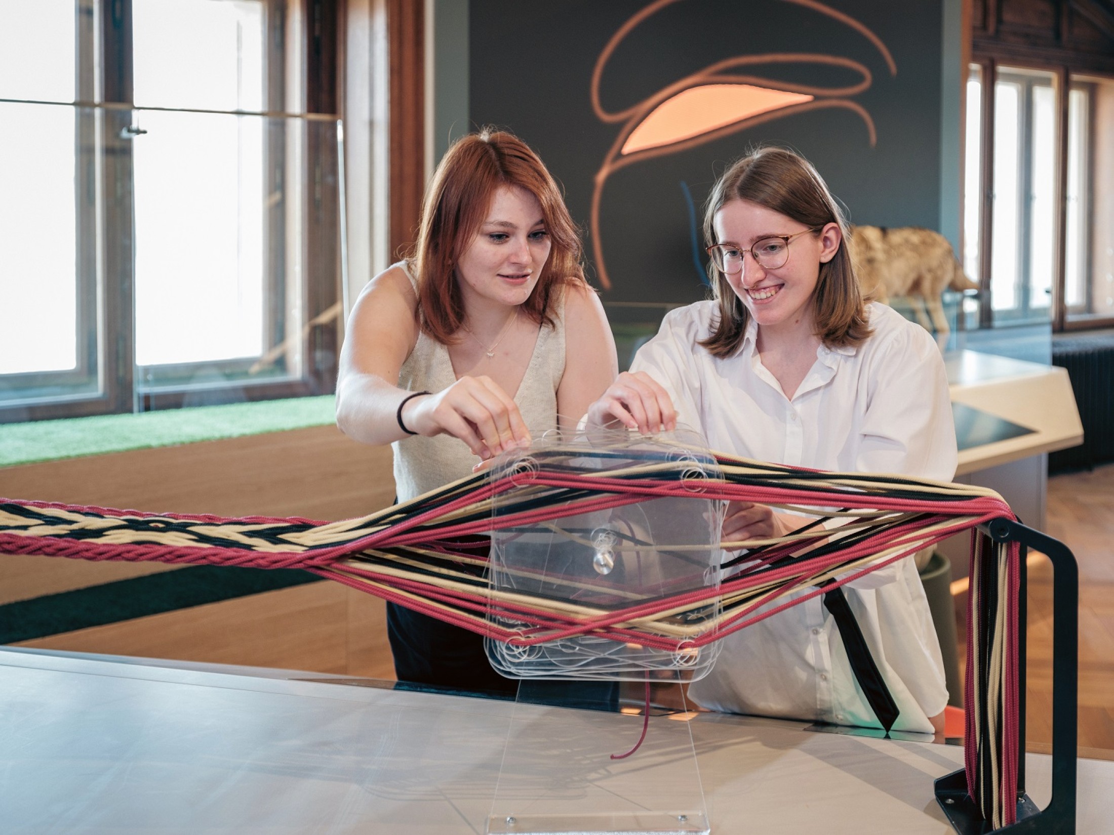 Dr. Karina Grömer und Mag. Andrea Krapf (Prähistorische Abteilung), Station „Brettchenweben“