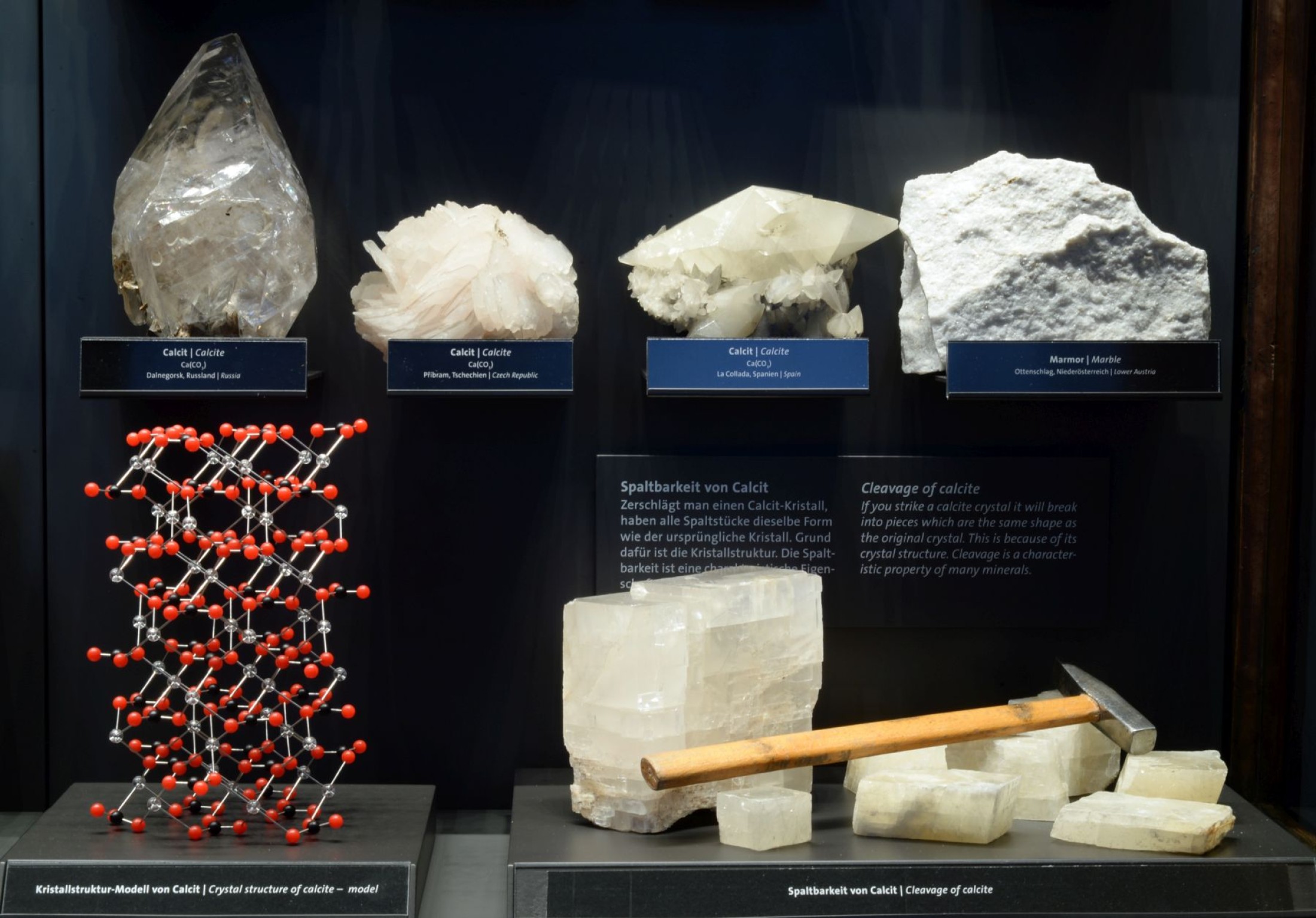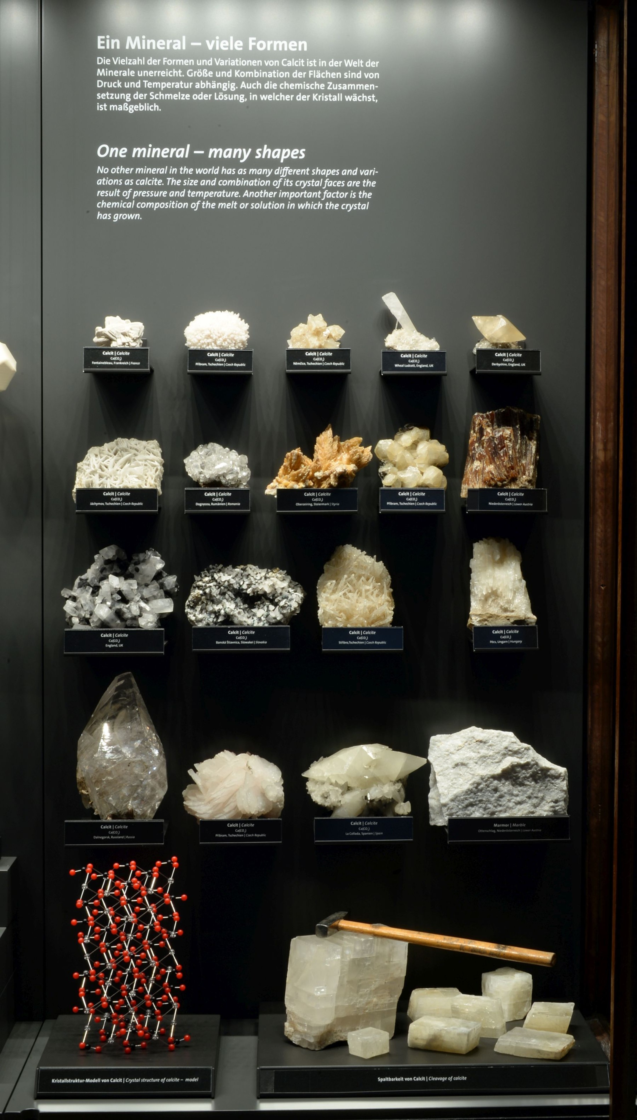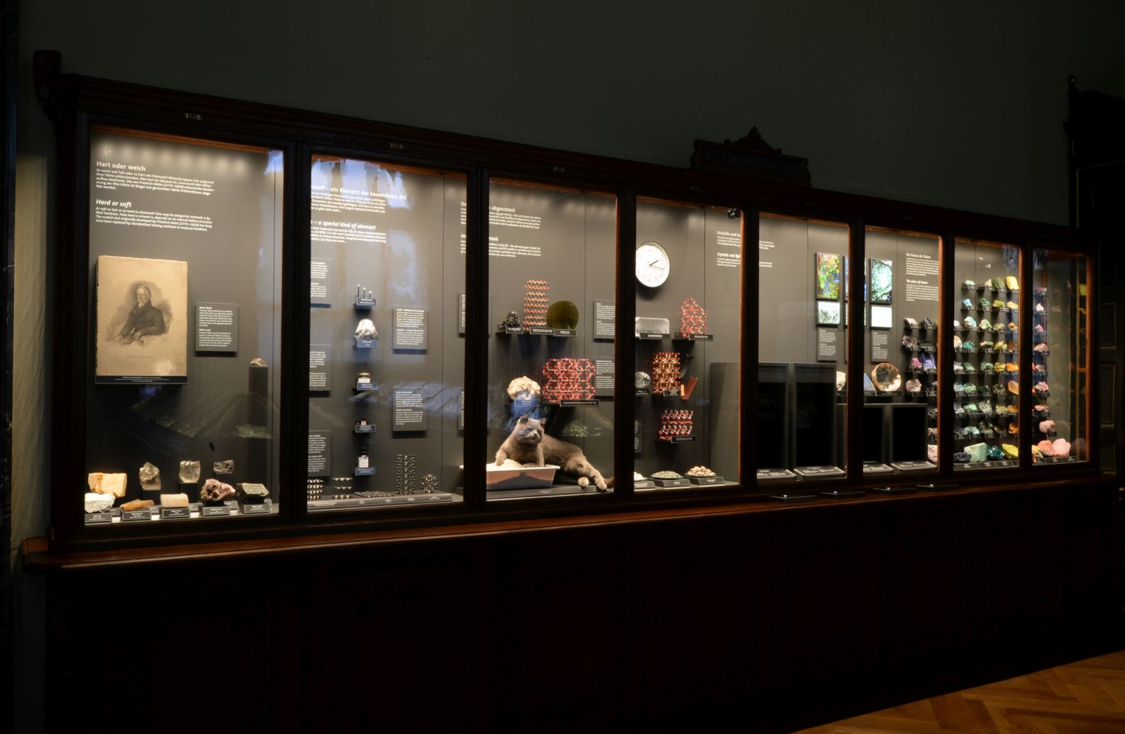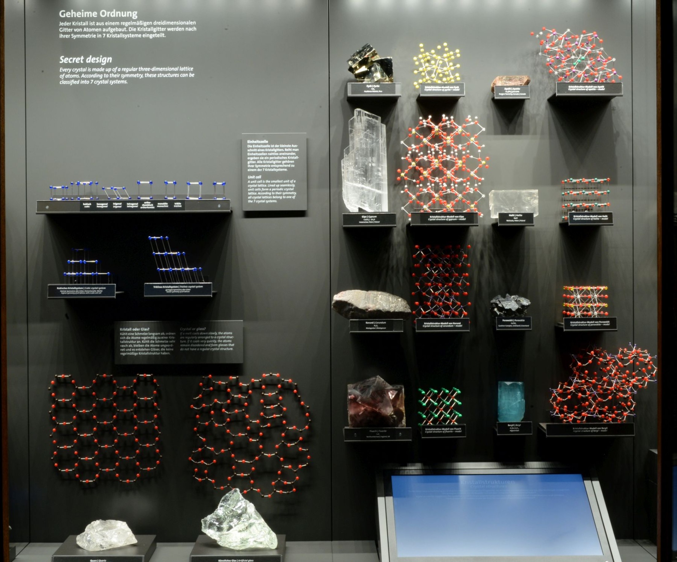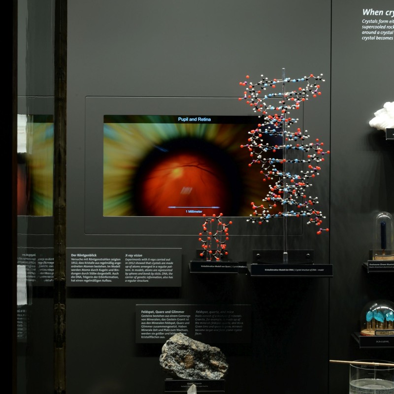 Die Kuratorin der Ausstellung und Sammlungsleiterin der Mineralien- und Edelsteinsammlung am NHM Wien, HR Dr. Vera M. F. Hammer, setzte die Vitrinen-Gestaltung gemeinsam mit dem Architekten DI Rudolf Lamprecht und dem Medientechnik-Team von 7reasons um.