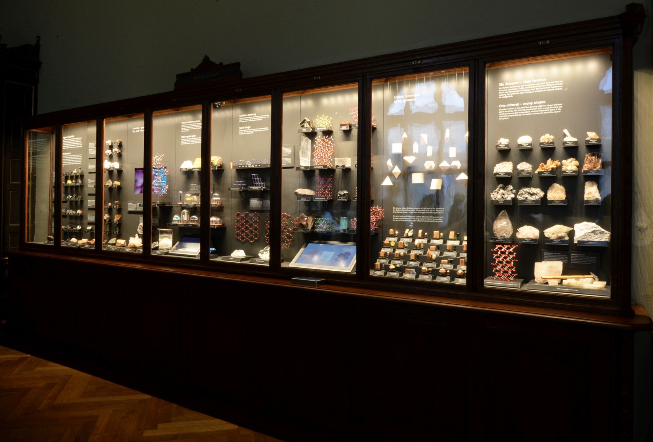 Kristalle haben mit ihren regelmäßigen symmetrischen Formen, mit ihrer Vielfalt und Farbenpracht Menschen seit Jahrtausenden fasziniert und gefesselt. Die Ausstellung kann als Reise durch die Welt der Kristalle gesehen werden, auf der optische Phänomene wie Doppelbrechung im Calcit, Dispersion des Lichtes an einem facettierten Edelstein und das Schillern des Opals ebenso erklärt werden wie das Kristallwachstum.