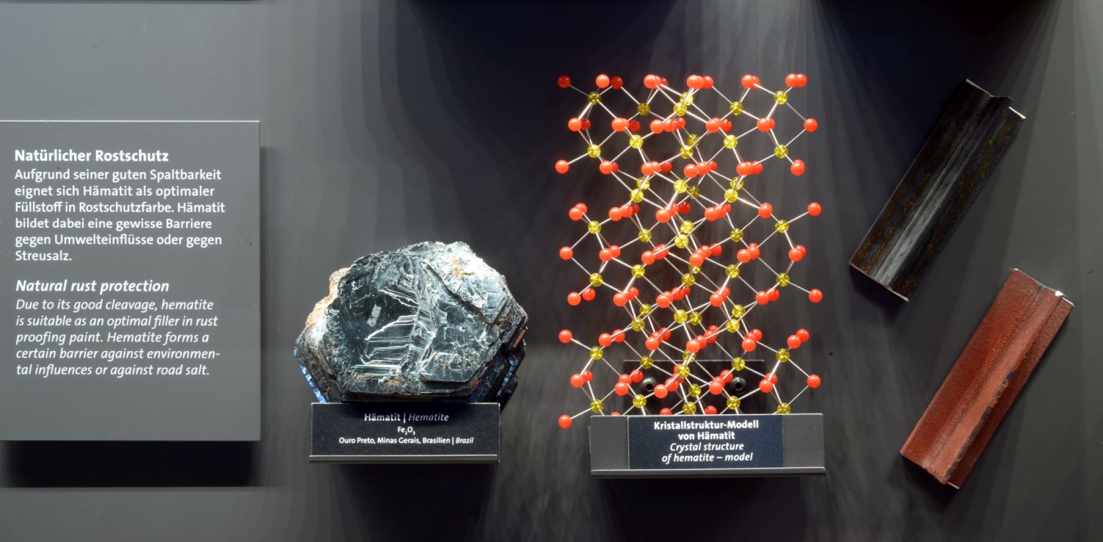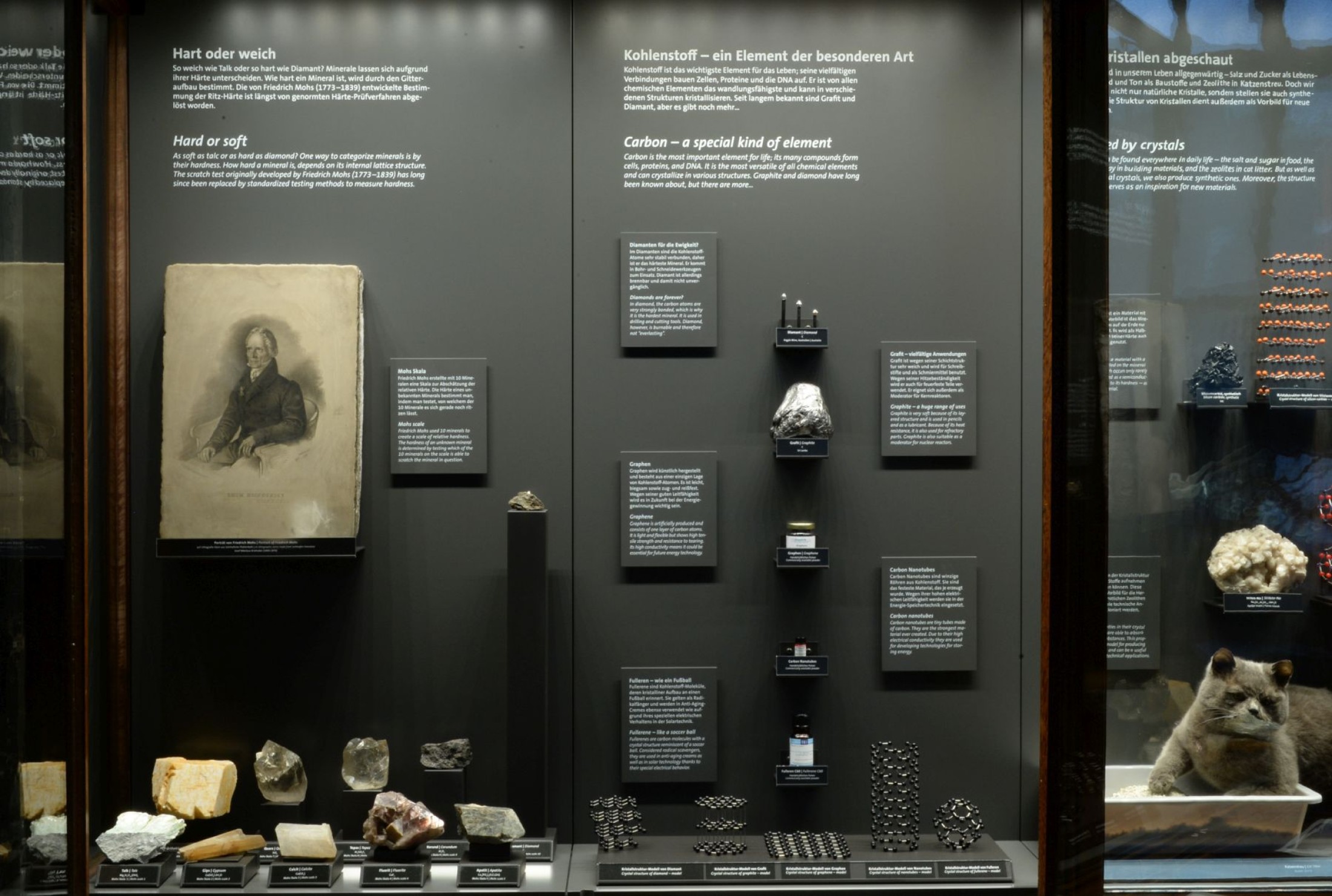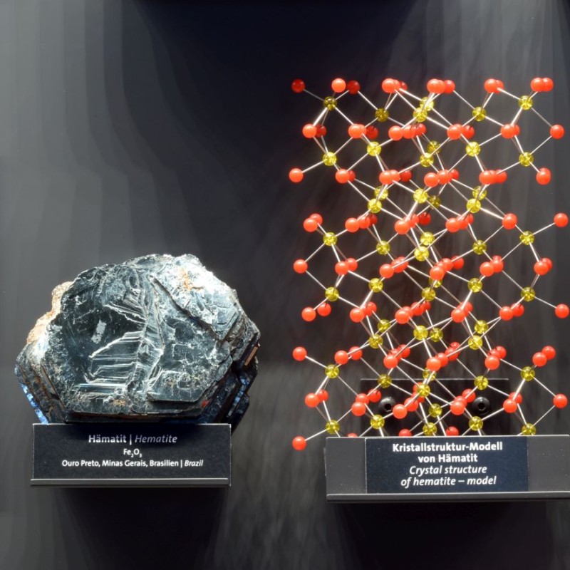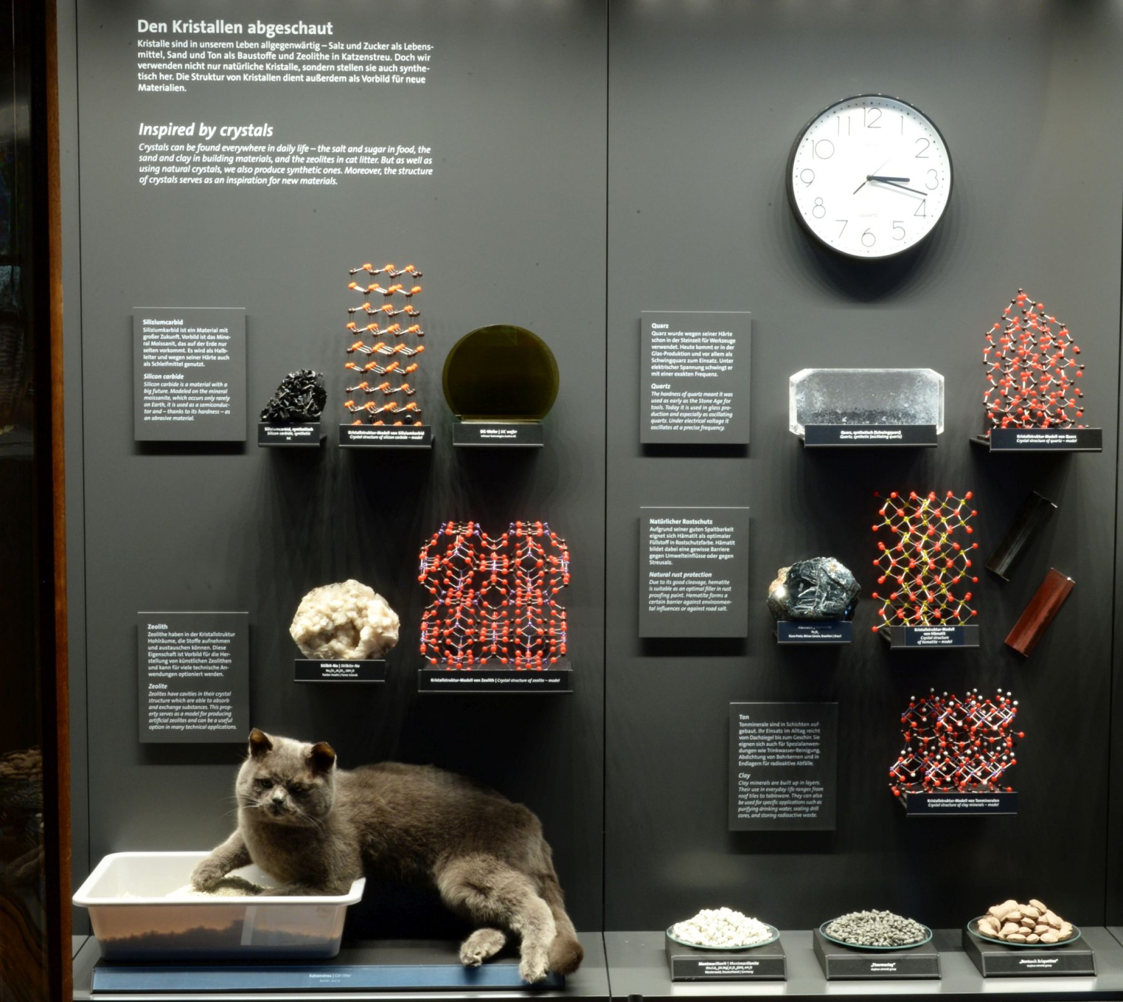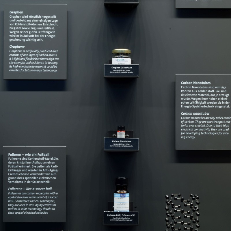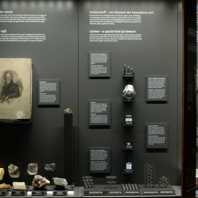 Darunter gibt es viele wichtige Erzminerale, wie die beiden wichtigen Eisenerze Hämatit und Magnetit, das Bleierz Galenit und das Antimonerz Stibnit. Andere Minerale wie Calcit, Gips und Tonminerale kommen als Baustoffe zum Einsatz; wieder andere dienen aufgrund ihrer Kristallstruktur als Vorbild für Kristallsynthesen. So wird das auf der Erde sehr selten vorkommende Siliziumkarbid mit dem Namen Moissanit heute künstlich erzeugt. Aufgrund seiner enormen Härte wird Siliziumkarbid nicht nur als Schleifmittel verwendet, sondern kommt als Halbleitermaterial für Energiesparchips in Elektroautos ebenso zum Einsatz wie als Wafer für Leistungsschalter. Der kristalline Aufbau und die damit verbundenen technischen Anwendungen werden durch ausgewählte aktuelle Beispiele veranschaulicht. So hat Kohlenstoff heute nicht mehr nur in Form von Grafit als Schmiermittel und als Diamant Bedeutung. Auch in Form moderner und zukunftsweisender Materialien wie Graphen, Nanotubes und Fulleren – synthetisch hergestellte Formen von Kohlenstoff, die aufgrund ihrer Kristallstruktur spezielle technische Anwendungen ermöglichen – ist er aus unserem Alltag nicht mehr wegzudenken.