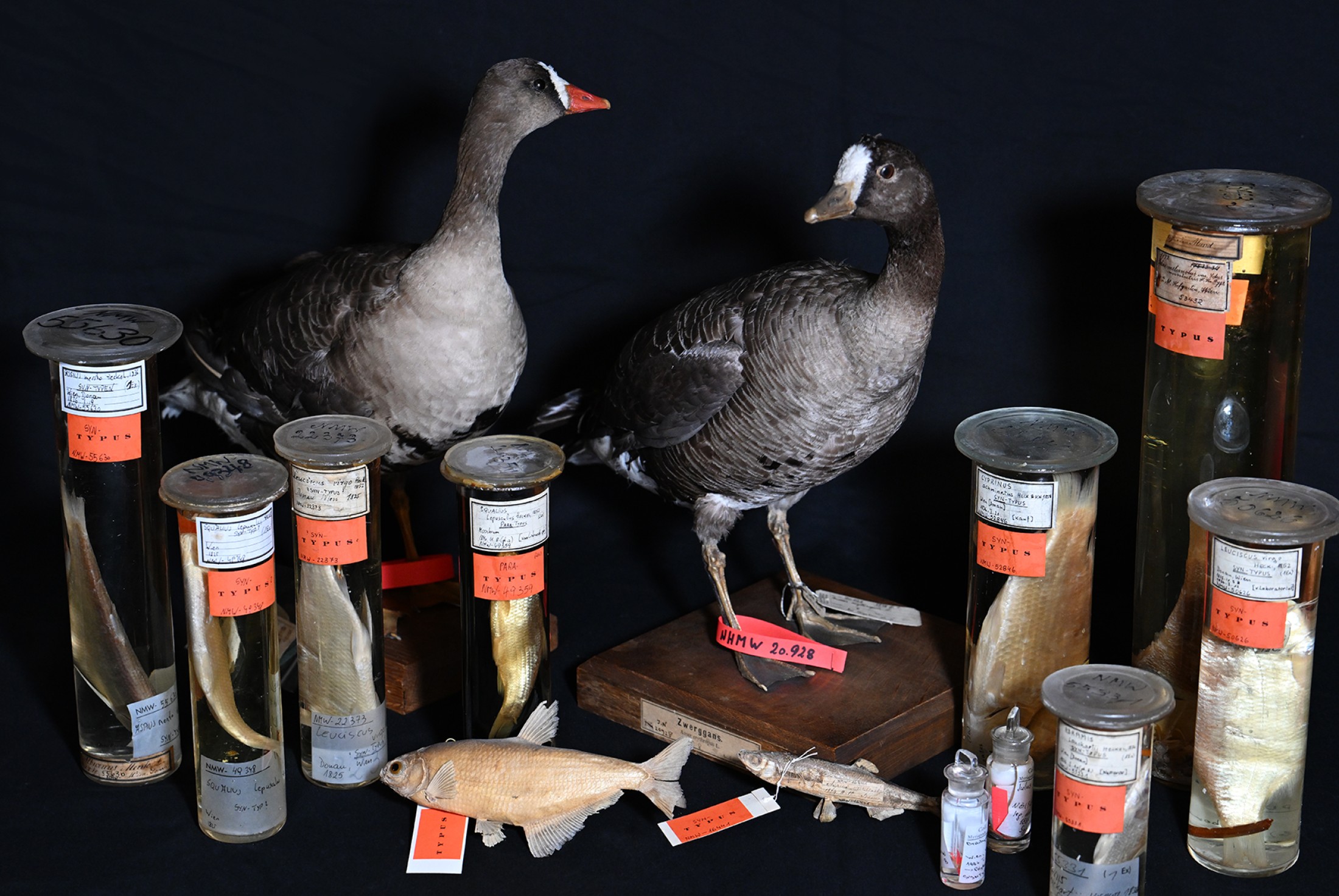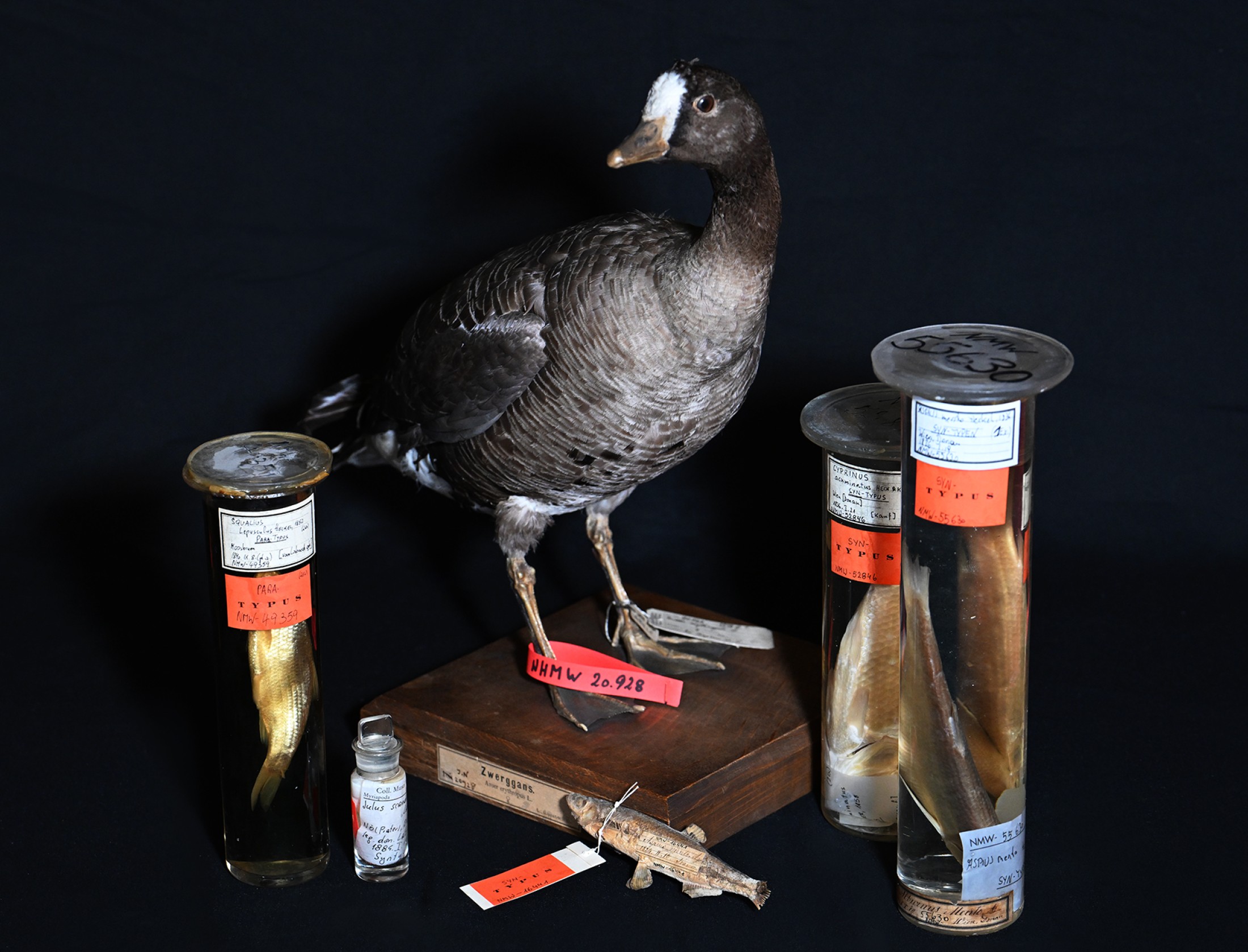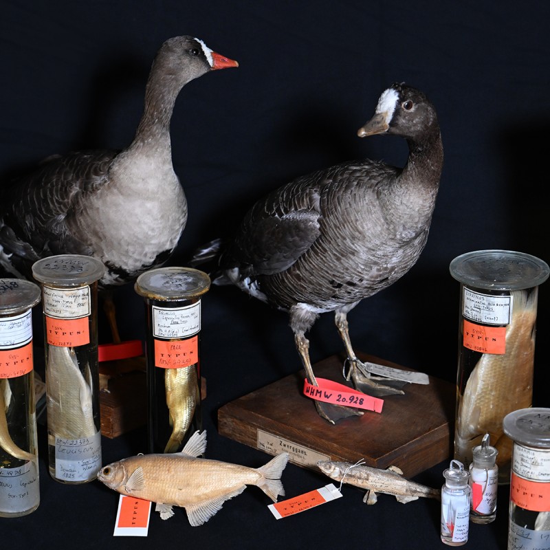 Da das Naturhistorische Museum Wien kein reines Ausstellungsmuseum, sondern auch ein Forschungsmuseum mit Schwerpunkt Taxonomie ist, wird hier eine besonders große Anzahl von sogenannten Typusexemplaren aufbewahrt. Diese für die Wissenschaft wertvollen Objekte sind die Referenzexemplare für die Beschreibung einer Art oder einer Gattung und sind in den Sammlungen mit einer roten Banderole oder roten Schildern gekennzeichnet. Die Typen werden für gewöhnlich nicht ausgestellt, sondern ausschließlich für die wissenschaftliche Arbeit verwendet. Typen müssen als physische Exemplare in den Forschungsstätten vorhanden und öffentlich zugänglich sein, denn wenn Forscher*innen irgendwo z.B. Käfer aufsammeln, die nicht eingeordnet werden können, helfen die Taxonom*innen in naturkundlichen Museen weiter und können sagen, um welche Art es sich handelt. Wissen sie es nicht und ergibt auch eine Literaturrecherche keinen Hinweis, dann handelt es sich mit ziemlicher Sicherheit um eine neue Art, die neu beschrieben und benannt werden muss.