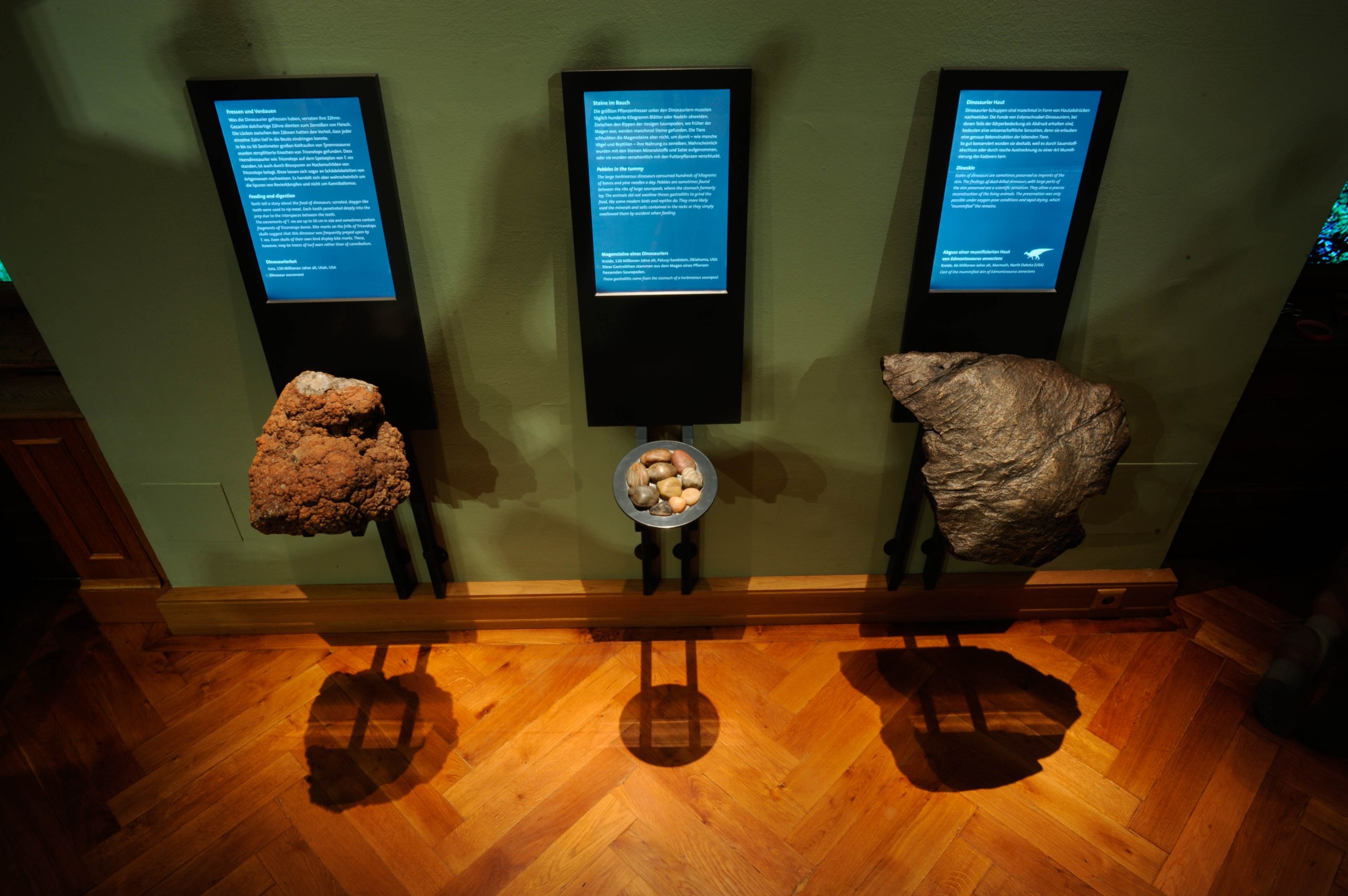 Magensteine & Saurierkot „Unser Ziel beim Entwurf eines neuen Sauriersaalkonzeptes war es, Wissenschaft zum Staunen und Anfassen ins NHM zu bringen. Mit dem beweglichen Modell eines Allosaurus, einem lebensgroßen Modell eines Flugsauriers mit 7 Metern Flügelspannweite, dem weltweit einzig bekannten vollständigen Skelett der Riesenschildkröte Archelon sowie interaktiven Stationen ist uns das - meiner Meinung nach - mehr als nur gelungen“, freut sich Köberl.