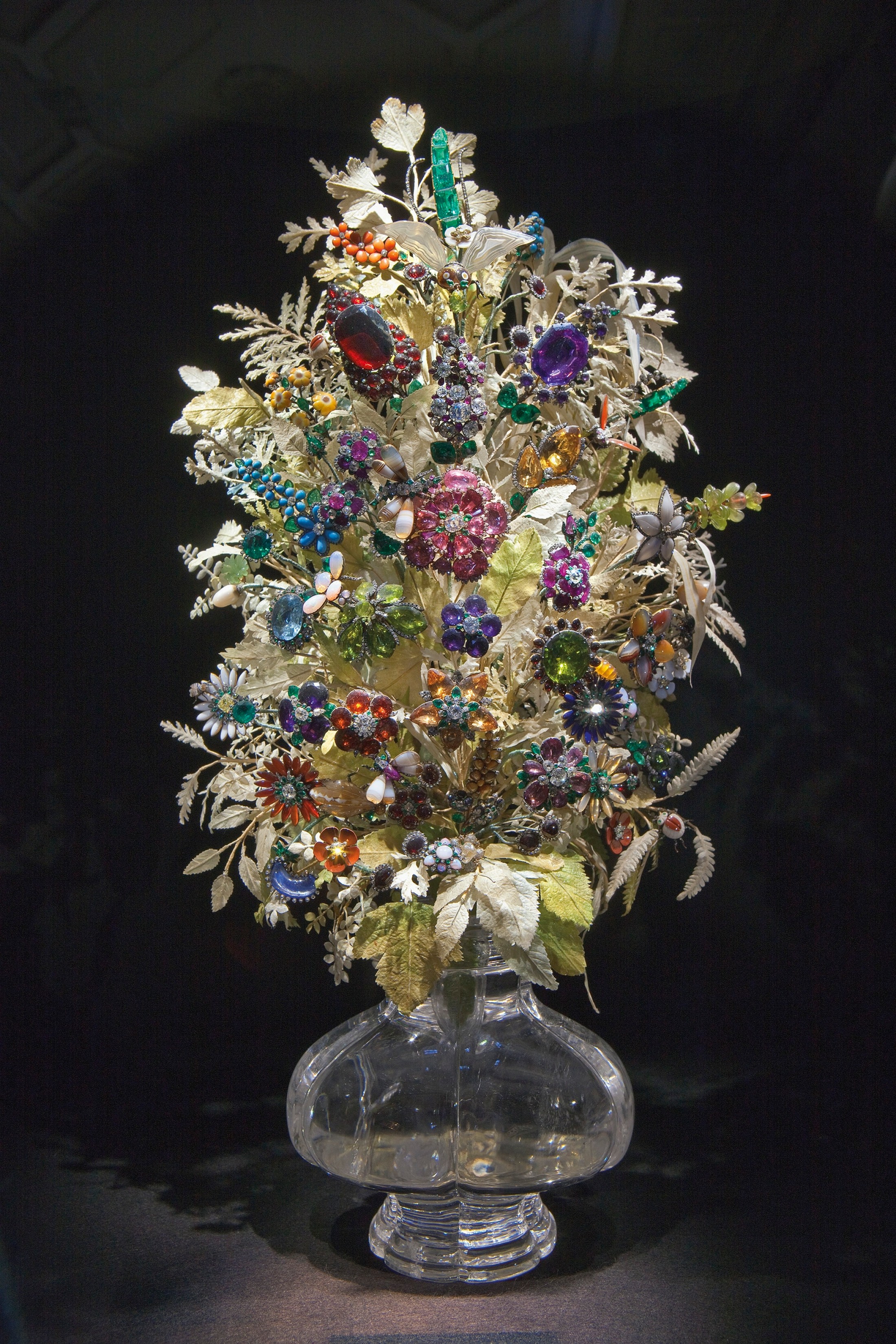 Eine Fülle glitzernder Blüten und Insekten aus edelstem Material: 2.102 Brillanten und 761 farbige Edel- und Schmucksteine wurden 1997 am Edelsteinstrauß gezählt. Die Vase ist aus Bergkristall geschnitten, die Blätter wurden aus hellgrüner Seide gefertigt; sie sind heute leider stark ausgebleicht.